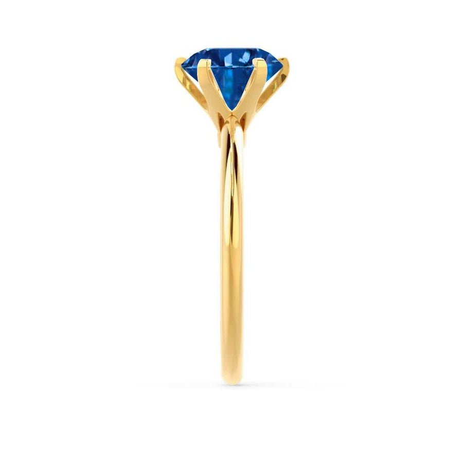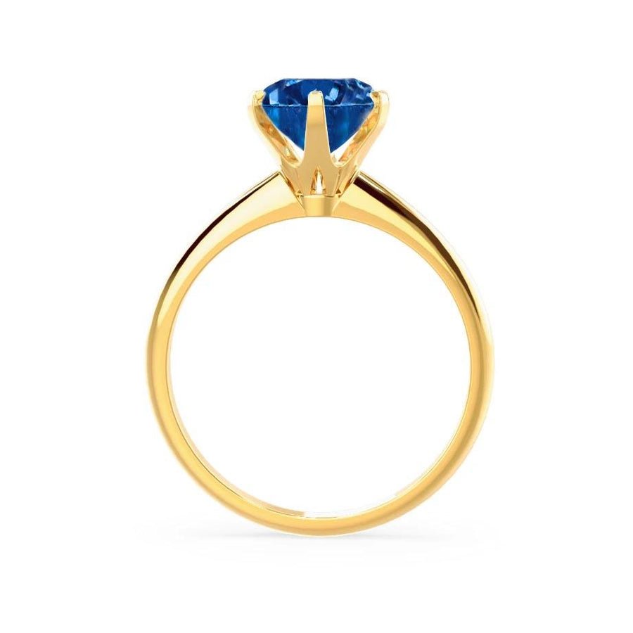 This stunning Blue Sapphire Round cut rind handcrafted in Polished 18Kt Gold is the Perfect everyday wear. This timeless setting is designed to fully showcase the center blue sapphire gemstone, with each prong perfectly tapered to expose as much of the center stone as possible, allowing as much light as possible to pass through the stone creating a breathtaking sparkle.