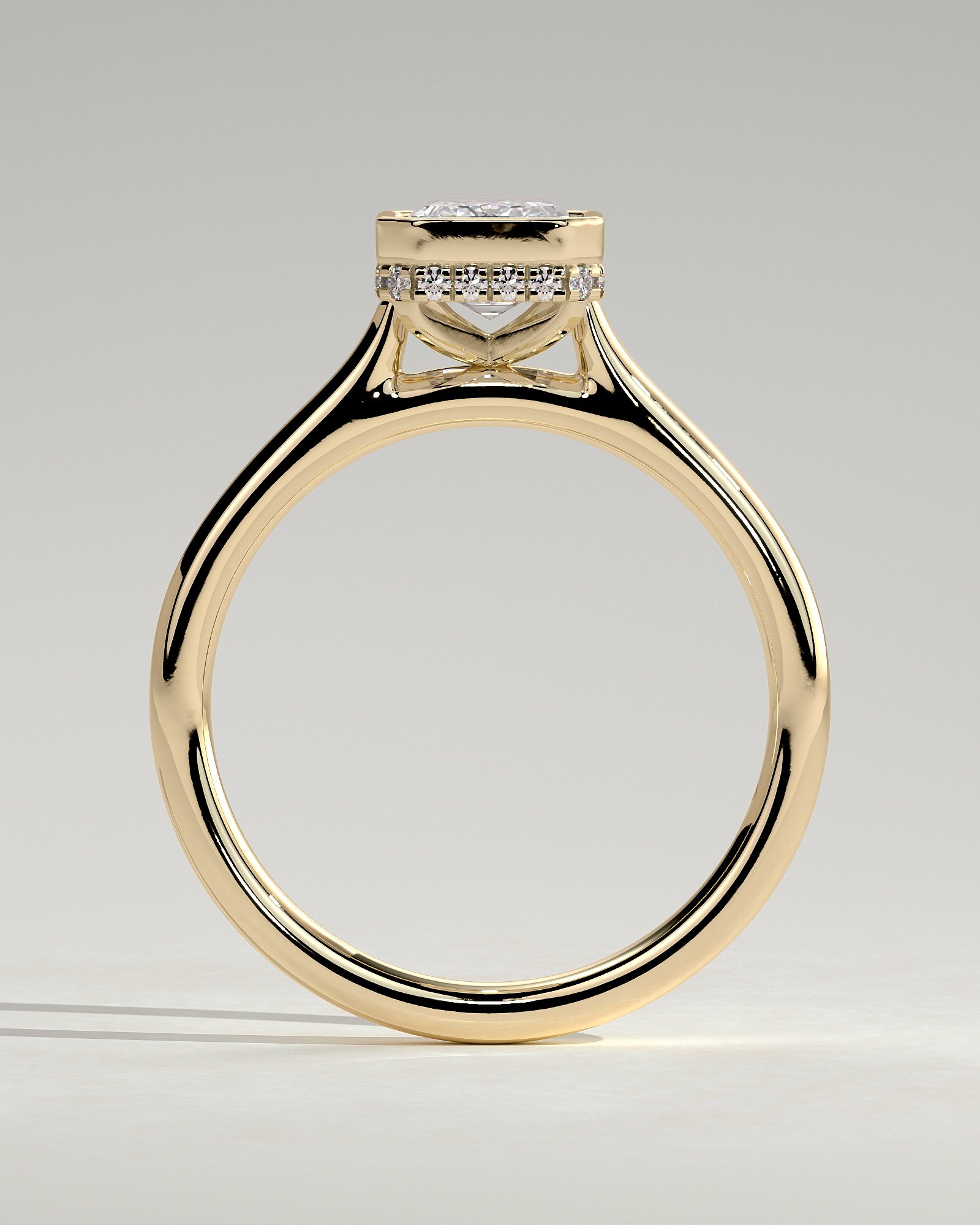 This stunning Cathedral set Engagement ring is a modern interpretation of the bezel design, encapsulating an emerald-cut center stone within a deep setting. A hidden pavé detail sits within the bezel, supported by a cathedral foundation for balanced structure.
