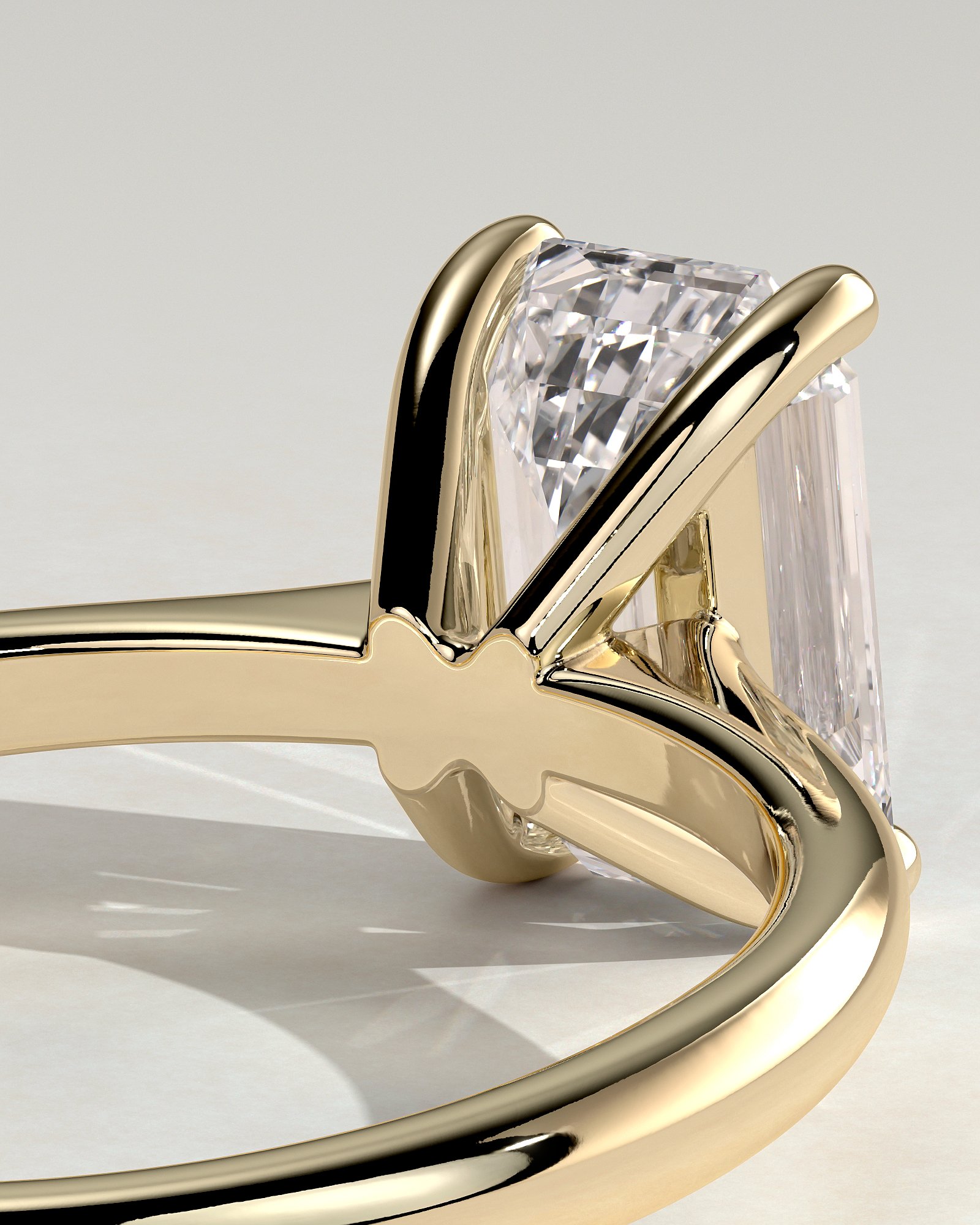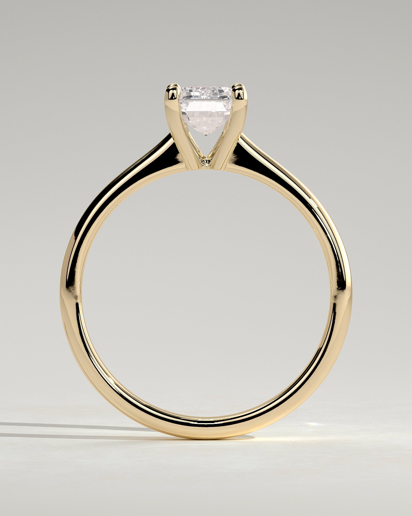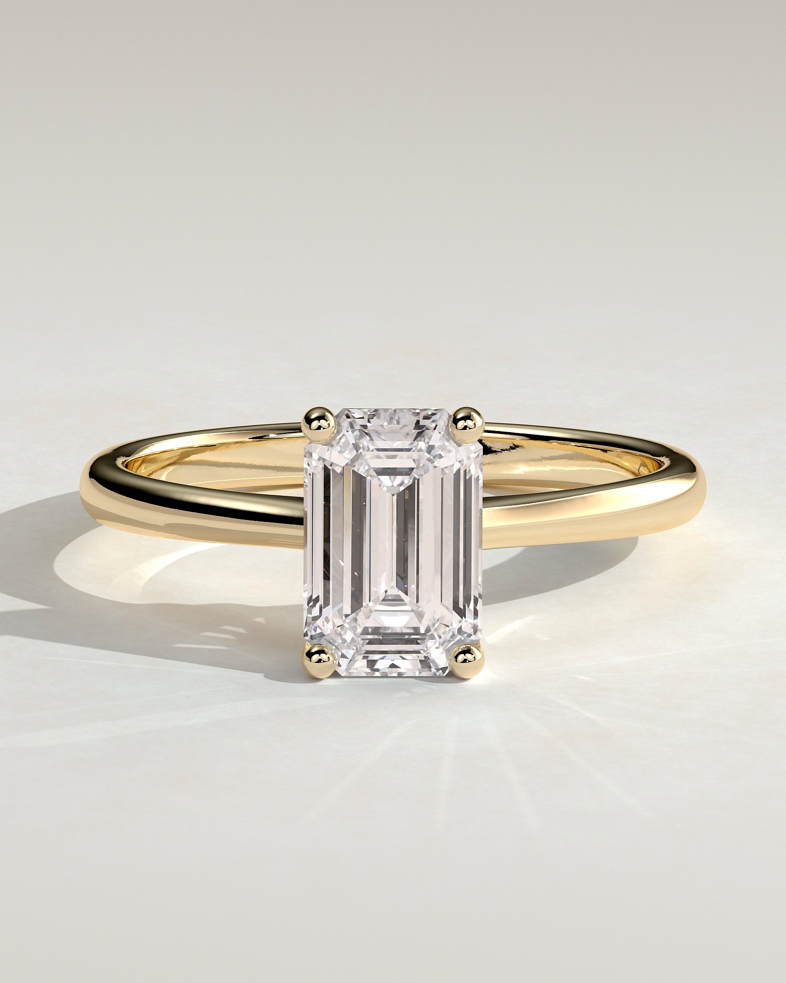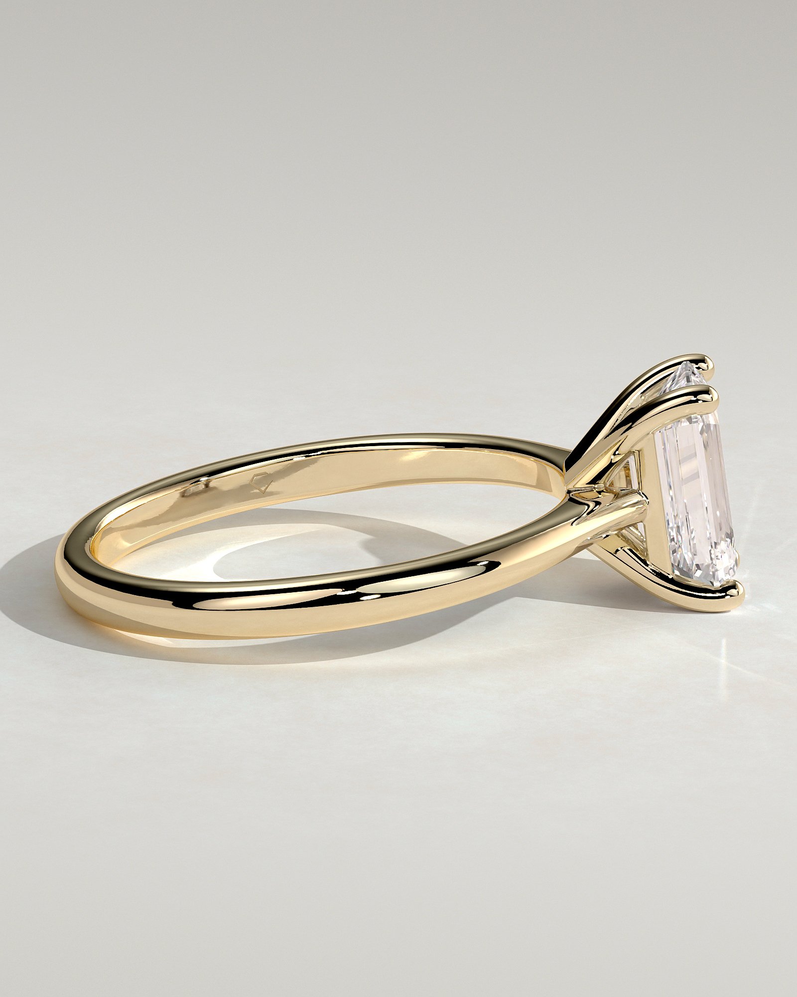 Sleek in its design, this stunner of an engagement ring features an elegant emerald cut center stone held by four round claws and set low on a slim tapered band. From the setting to the shine, every detail is deliberate. A timeless design meant to be worn daily, admired endlessly, and cherished for everything it represents.