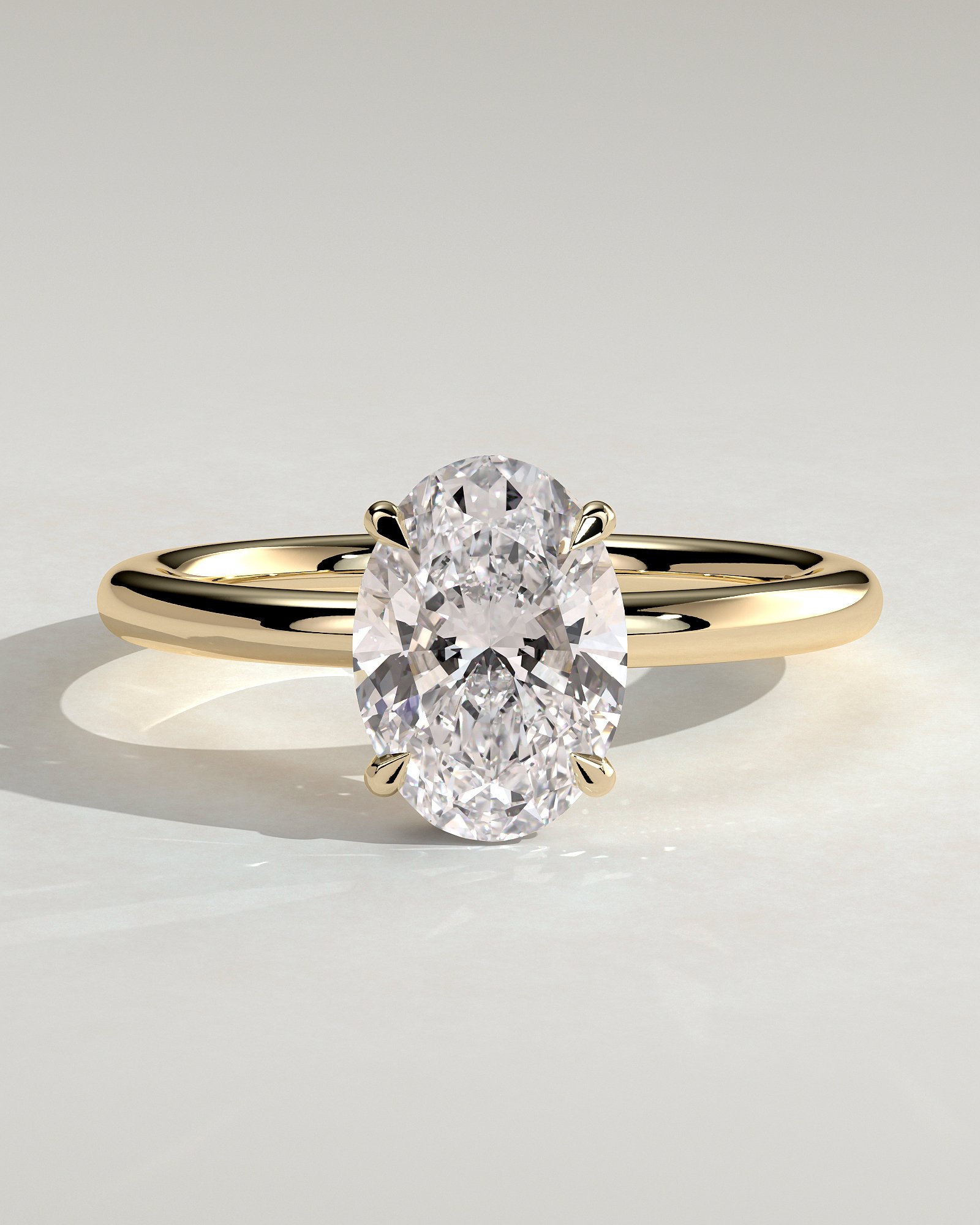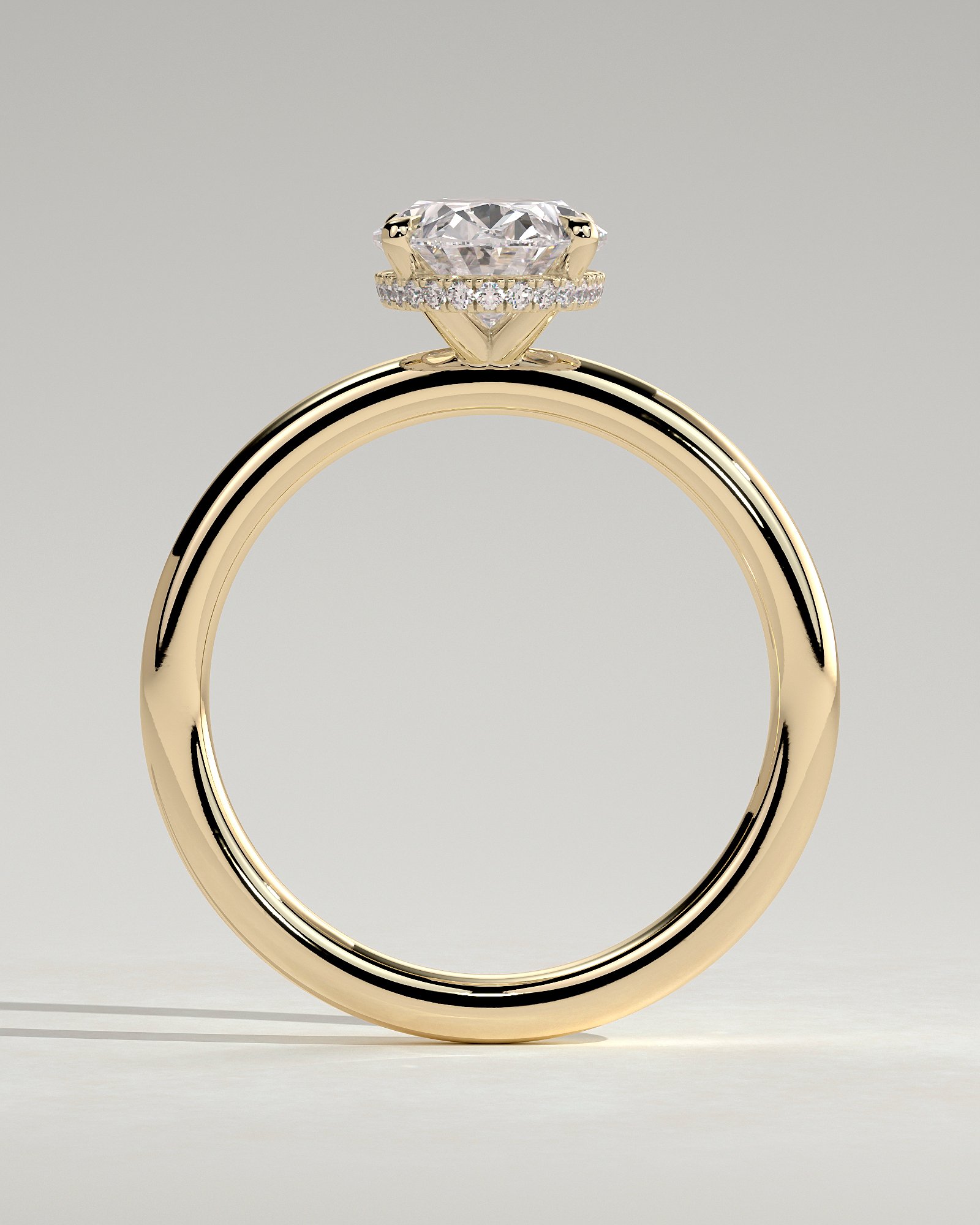 The elegant engagement ring is a 4-claw oval solitaire with a dazzling wrap-around halo which is handcrafted to enhance the brilliance of the Center Diamond. From its flawless finish to its enduring structure, every detail is intentional. Creating a piece that feels contemporary today and classic for generations to come.