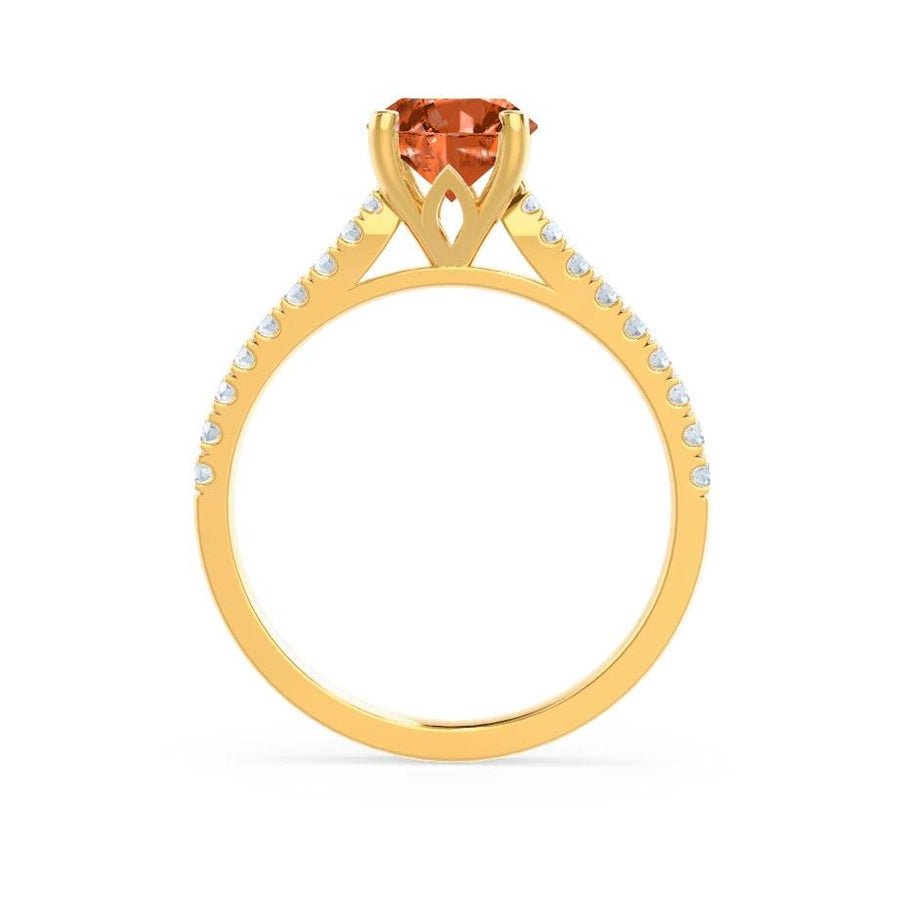 This elegant and feminine 18K yellow gold engagement ring features a stunning oval cut Padparadscha sapphire center stone, perfectly complemented with a dazzling pavé setting  conflict-free diamonds on each shoulder. With a super sweet lotus basket, this gorgeous engagement ring might be as feminine as it gets!