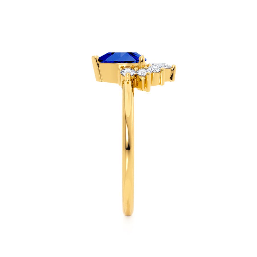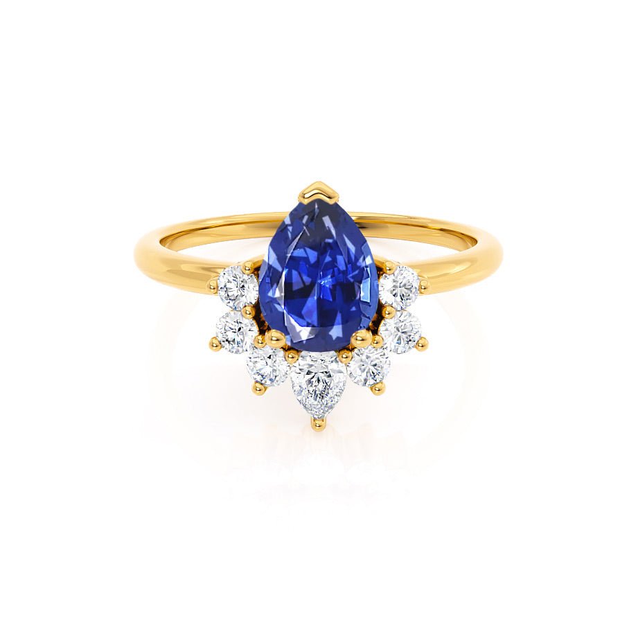 Elegant yellow gold ring featuring a pear-cut blue sapphire center, encircled by sparkling round diamonds in a floral halo. Delicate prongs and a refined band create a timeless, romantic design with brilliant contrast and graceful sophistication for modern heirloom appeal.
