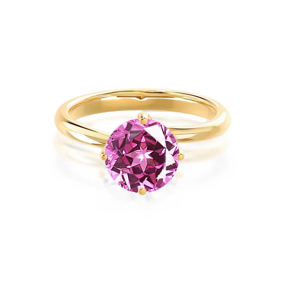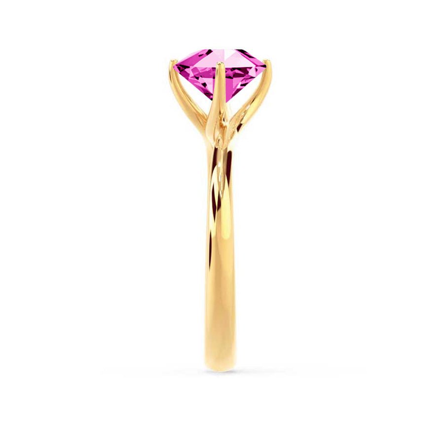 This exquisite solitaire ring features a brilliant round Pink Sapphire center stone. Perfectly showcased by an impressive and unique twisted 4 prong head mount, crafted in 18k Yellow Gold or White Gold which has been designed to secure and beautifully showcase even the largest of center stones.